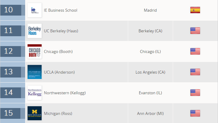 Stanford GSB is ranked 4 while London Business School occupies the 5th spot. Pennsylvania University’ Wharton is 6th, MIT Sloan 7th, Colombia 8th, Oxford Said 9th and IE Business School 10th.