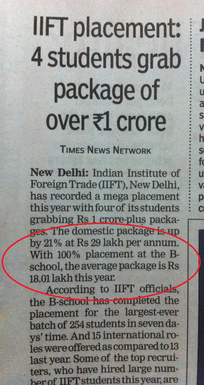 Even the 1 crore maximum package claim is bogus. I have a friend in IIFT (whose name I cant share for obvious reasons), who told me that this package is for guys posted in Africa. And even in Africa, you only get something like 60 lakh rupees per annum. And the rest 40 lakhs is kept by the company in an insurance corpus fund. If and when you do get kidnapped in Africa, the insurance money will be spent by the company to get you freed. You yourself never get that money. But while showing your annual package, these companies include that 40 lakhs. And IIFT knows this fact, but doesnot want the public to know about it.