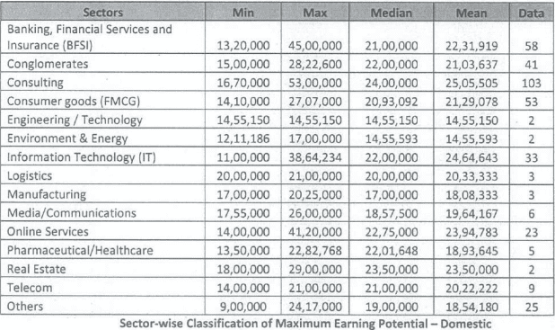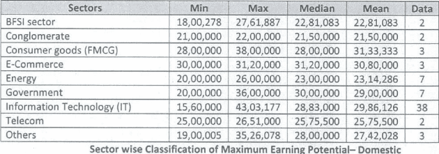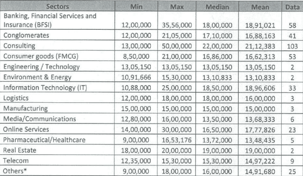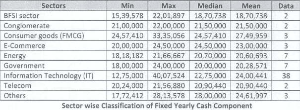 In MEP, the Median was Rs 28,00,000 and Mean 28,48,538. Sector-wise, maximum MEP was in Information Technology (IT) at Rs 43,03,177 (Median Rs 28,83,000 and Mean Rs 29,86,126). Consumer goods (FMCG) comes next with MEP of Rs38,00,000 (Median Rs 28,00,000, Mean Rs 31,33,333).