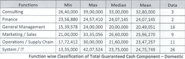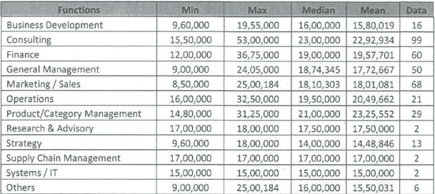 Function-wise, the MEP is maximum in Consulting at Rs 43,03,177 (Median 36,60,000) followed by System/IT at Rs 42,07,524 (Median Rs 28,28,000, Mean Rs 28,62,040).